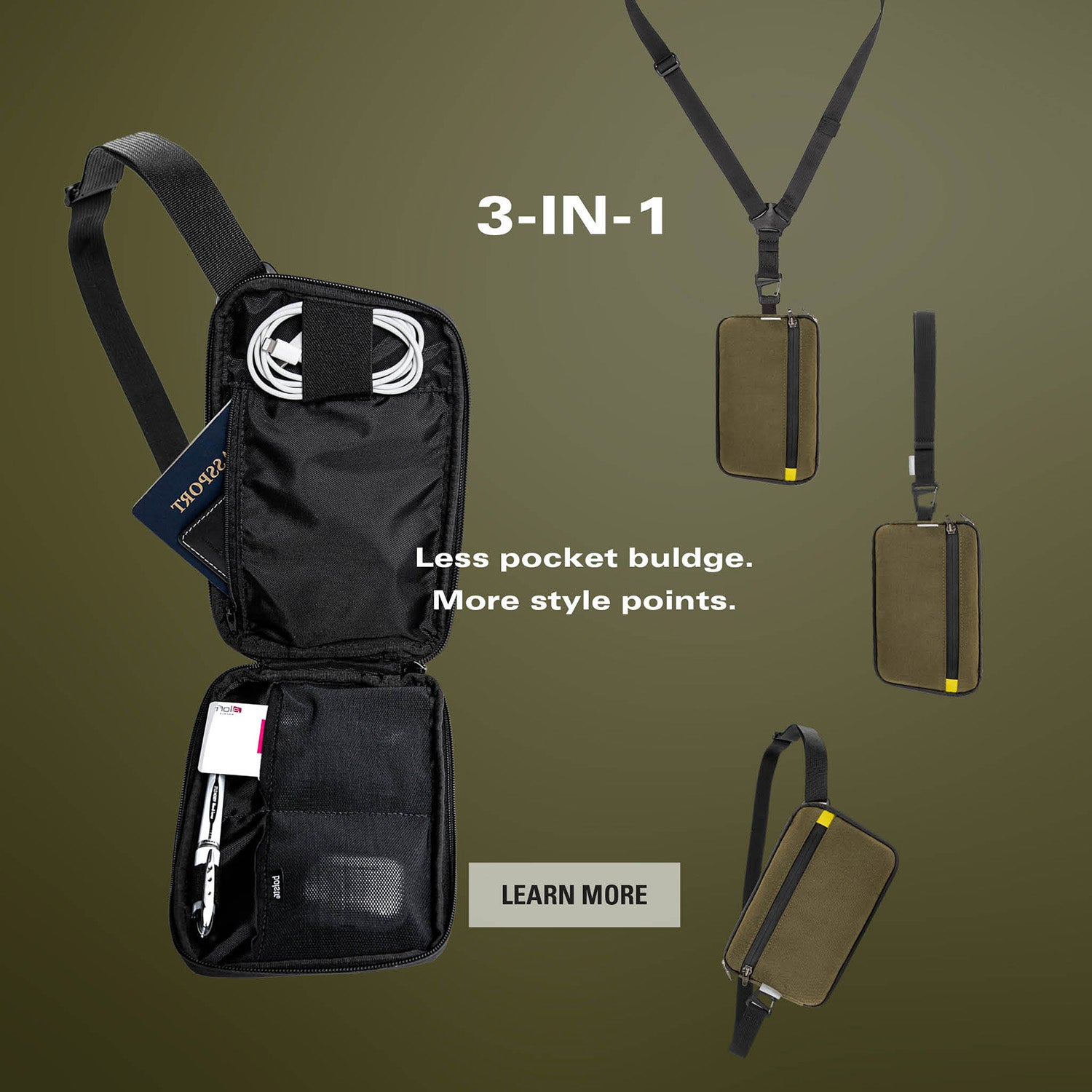 Accommodates bare daily essentials and designed to be worn, hand carried or used in-bag.